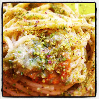 Spaghetti con Alici Fiori di Zucca e Pistacchio di Bronte
